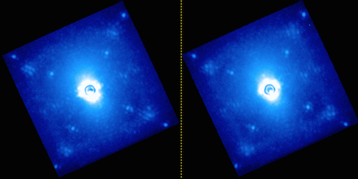 For some images, particularily images with very strong halos and/or very low signal-to-noise in the satellite spots, the algorithm will fail. When this occurs the user has four levels of intervention to help remedy the situation. The first is to modify the search_window parameter from the recipe editor. Expanding this to larger numbers will sometimes allow convergence with zero impact on the processing time. The user can also apply a constraint on the distance between the satellite spots according to their wavelength, this is accomplished using the constrain parameter. A more robust method is to high-pass filter the image prior to running the algorithm. This is accomplished by modifying the highpass parameter, which declares the size of the side of median box filter. A box size of 15-25 is generally recommended. Note that this will provide a noticable reduction in the processing speed (~10 seconds per image). Lastly, the user can input the coordinates manually using the loc_input and x1,y1,x2,y2,x3,y3,x4,y4 parameters and the reference_index for these values.
