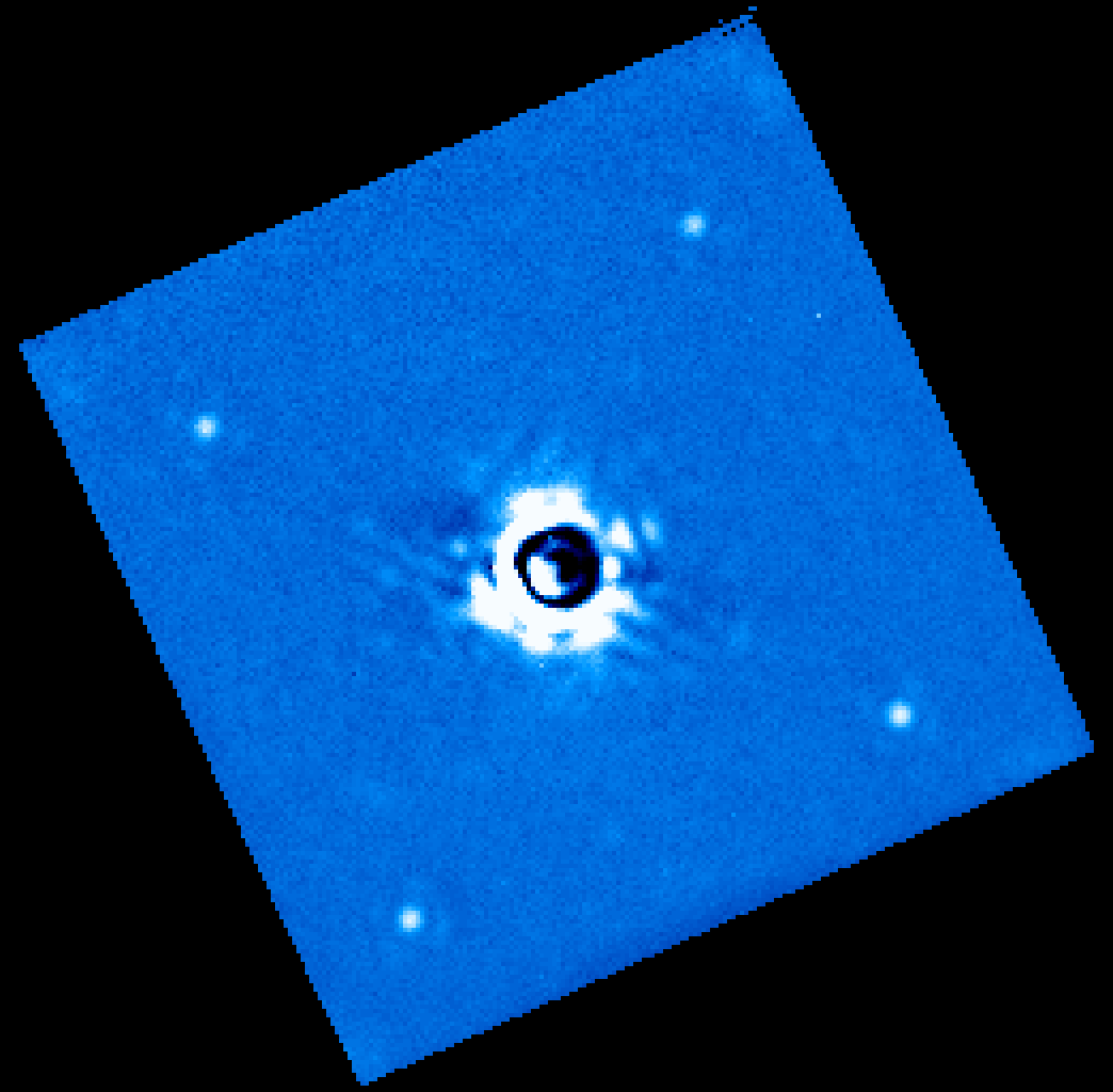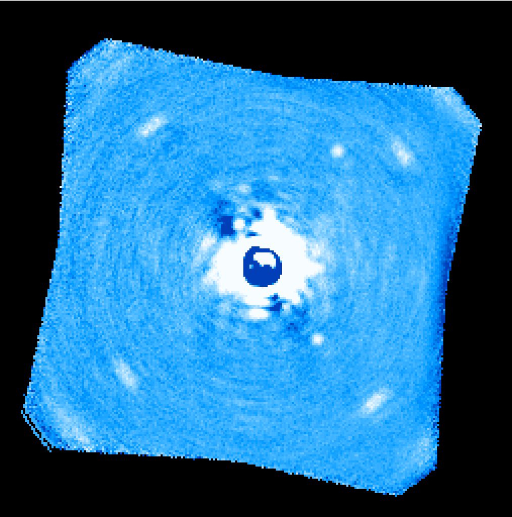 A single wavelength slice from stacking several datacubes of a well-known system of companions. Note that no companions are visible but the SNR of the satellites is decent.