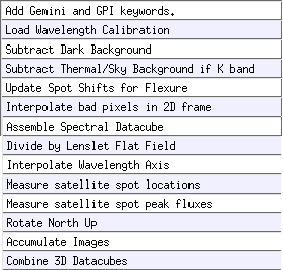 Note that in the case below the satellite spot locations were measured BEFORE doing a median of the stack. It is also possible to place them AFTER the Combine 3d Datacubes primitive. However, if this is done, one must be sure that the SAVE parameters in the Measure satellite spot locations and Measure satellite spot peak fluxes primitives are set to 1. In this example, I’ve also modified the SPECTYPE and HMAG keywords using the Add Gemini and GPI keywords primitive mentioned above.